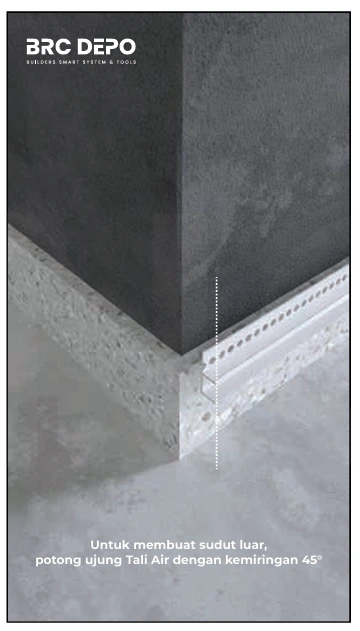 Siapkan tali air sesuai panjang area yang akan dipasang. Untuk sudut luar, potong ujung tali air dengan kemiringan sekitar 45° agar sambungan terlihat rapi. Periksa kembali hasil potongan sebelum pemasangan.